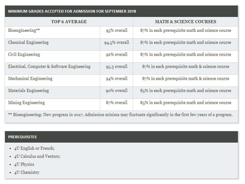 生物工程要求总平均分至少95%、化学工程要求总平均分至少94.5%、土木工程要求总平均分至少92%、电子、计算机及软件工程要求总平均分至少95.3%、机械工程要求总平均分至少94%(以上学科要求申请的数学及科学课程至少87分),材料工程要求总平均分至少90%、矿物工程要求总平均分至少87%(以上学科要求申请的数学及科学课程至少85分)