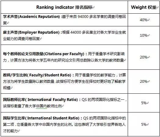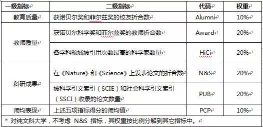 由中国的上海软科教育信息咨询有限公司发布,始于2003年。排名指标和权重如下表,是四大排名中最看重学术力的榜单,十分依赖学术奖项和理工类研究成果,轻人文,且排名指标均以数量作为衡量标准。对就业情况在四大中是最不关注的。