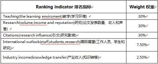 由英国《泰晤士高等教育》(Times Higher Education,简称THE)发布,始于2004年,对英国院校相对偏爱。排名指标和权重如下表,在学术力方面的关注好于QS,但论文引用率占比过大,达到30%。