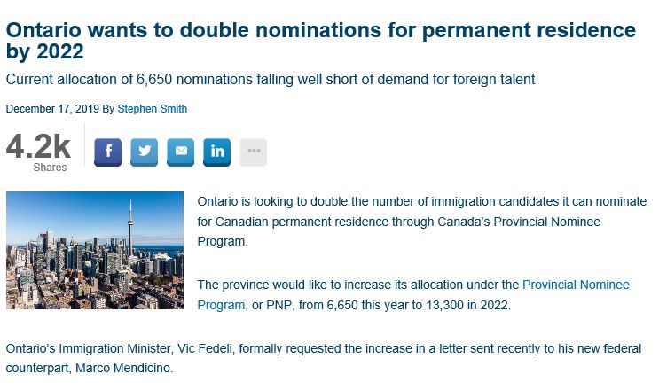 为了配合联邦政府的号召,就在12月17日,安省官宣,安省移民部有意在未来的两年中把省提名PNP名额增至目前名额的两倍,也就是到2022年可以把目前只有6650的名额增至13,300。覆盖申请类别包含安省企业家,海外雇员,国际毕业生,硕士博士,高需职业等。