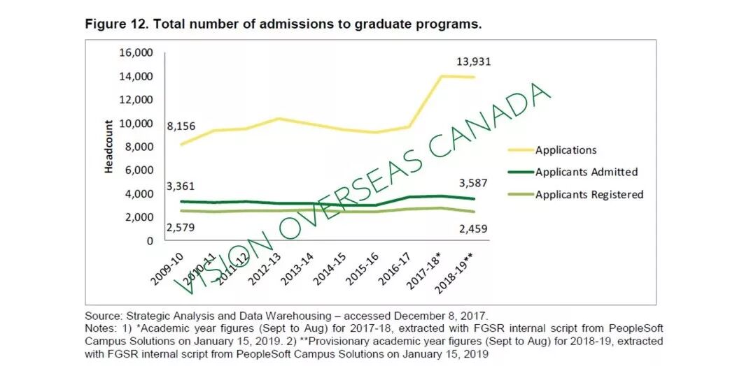 阿尔伯塔研究生院收到的申请,从2017年开始暴涨,大概8000多个申请涨到了14000个申请。然而录取的人数几乎保持不变,到了2018-2019年度,13931个硕博申请,只录取了3587个人,然后有2459个学生选择入读阿尔伯塔。