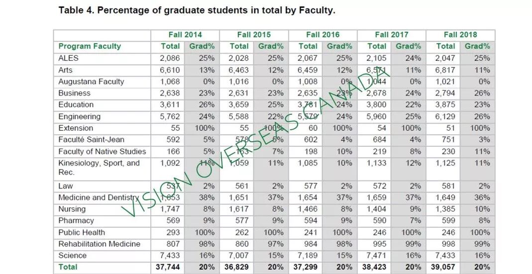 “在阿尔伯塔就读的研究生及以上的学生占到了人数的1/5,并且研究生及以上阶段中,37%的学生来自加拿大以外的国家。在过去的10年里,女性学生占到了研究生的更多人数,然而在博士阶段,男性更多。”