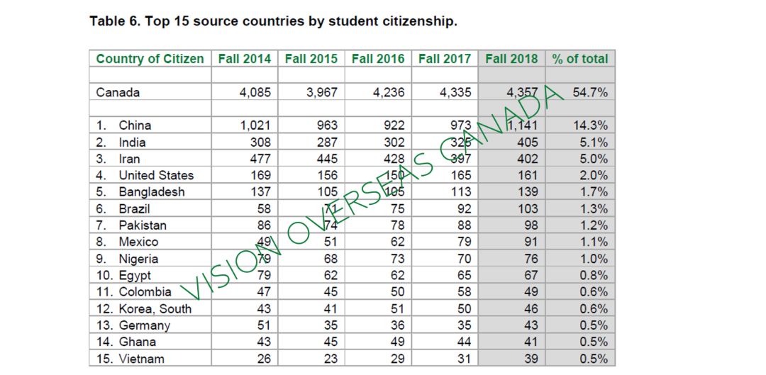 阿尔伯塔的国际生中各个国家的人数总结:中国人一共有1141个,占到了14.3%,其次是印度的405人和伊朗的402人。