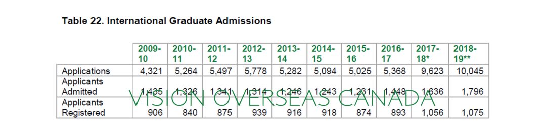 2018-2019年度一共收到了10045个国际留学生的申请,最终只录取了1796个学生,最终有1075个人成功注册入读。