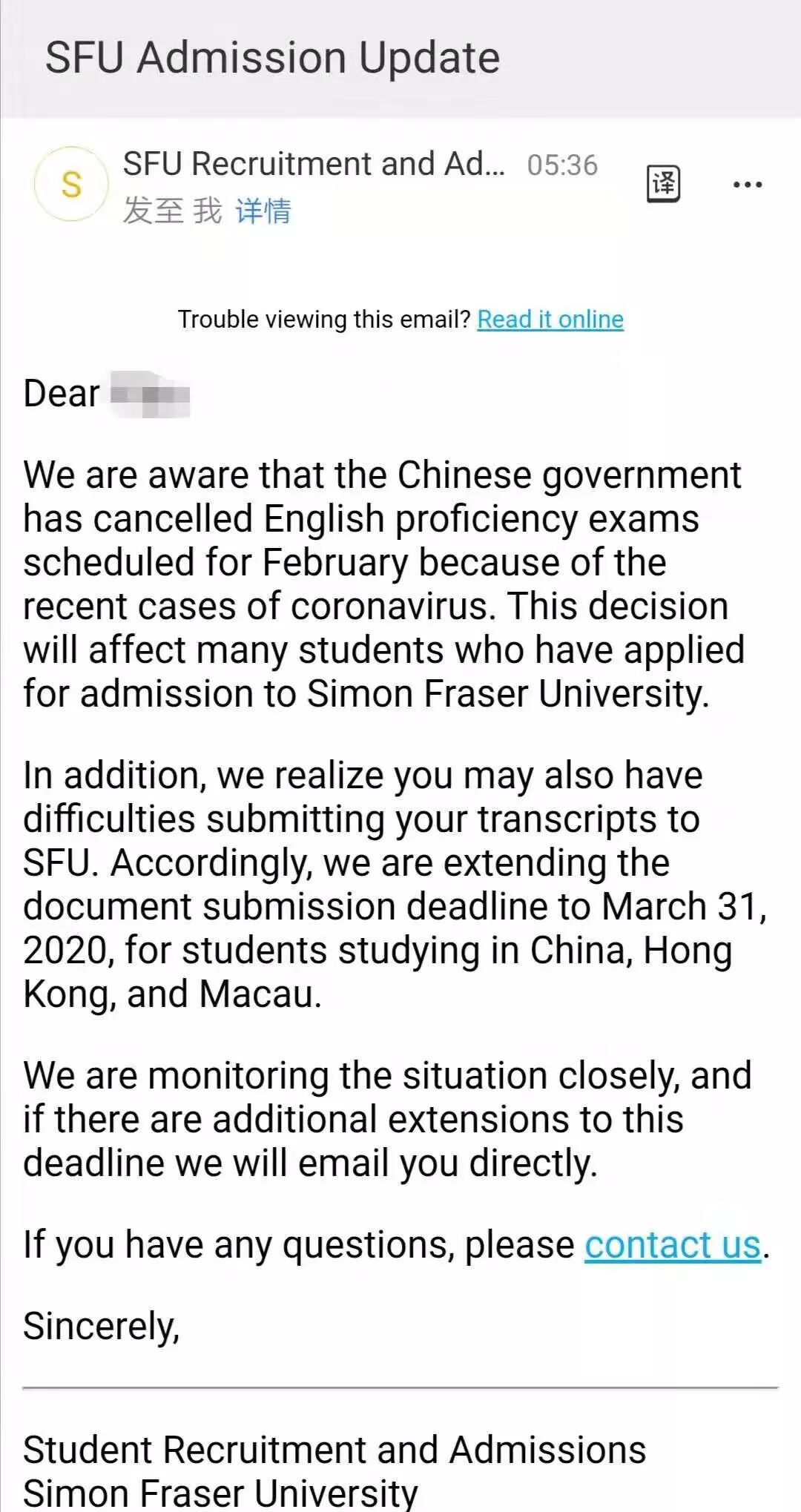考虑到中国新型肺炎疫情和雅思考点的关闭,将国内申请者语言成绩提交的截止日期延期至2020年07月1日。满足学术条件的申请着,将发放有条件录取。