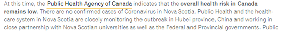目前加拿大公共卫生署表示,加拿大的总体健康风险仍然很低。新斯科舍省没有确诊的冠状病毒病例。新斯科舍省的公共卫生和卫生保健系统与新省大学以及联邦和省政府合作,正在密切监测中国湖北省的疫情。