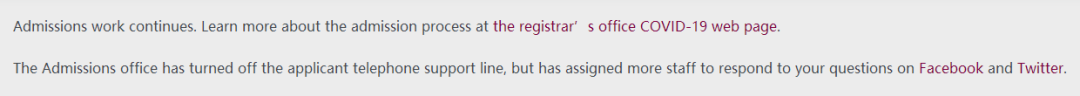 虽然电话热线关了,但是学校会派招生官们到Facebook和Twitter上在线解答申请者们问题。