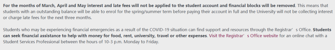 来自麦克马斯特大学,对于三月、四月、五月你迟交的罚款利息将不会被收取。即便暂时学费欠费,也可以正常注册下个学期的课程。如果需要救助,学生可以向学生注册中心申请援助,包括食物、房租、旅行费用等。