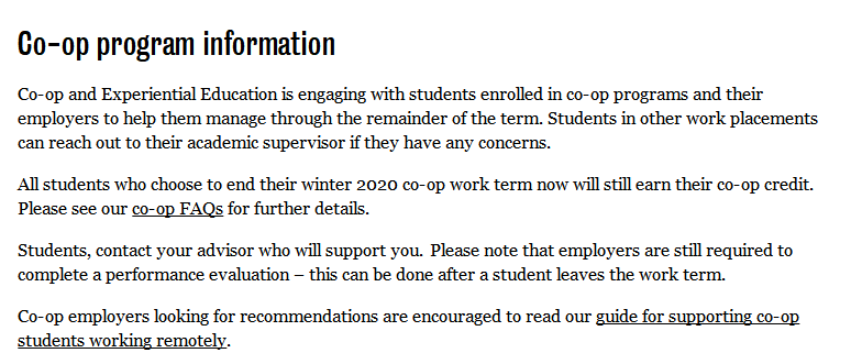 滑铁卢大学的coop项目非常出名,在这个特殊时期,学校的coop项目会按照学习进度正常推进,学校正在积极与雇主们沟通,并将coop项目都转成线上办公,雇主们也会正常给参加项目的同学做绩效评估。