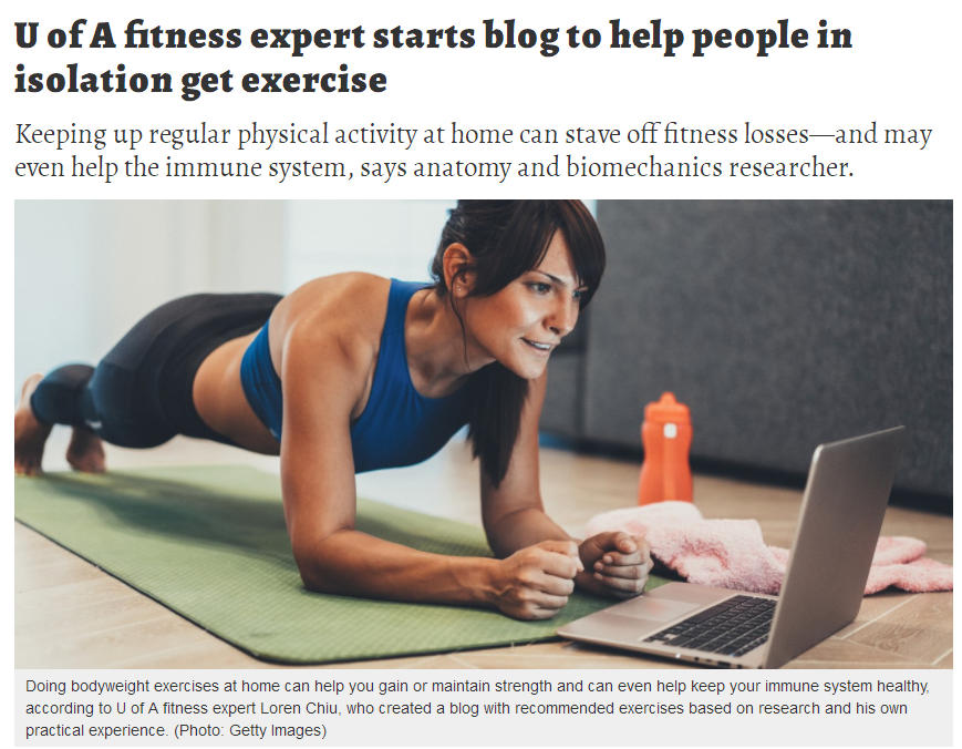 阿尔伯塔大学的健身专家Loren也在线上开设室内健身课程,传授在家健身的经验,帮助大家提升免疫力。