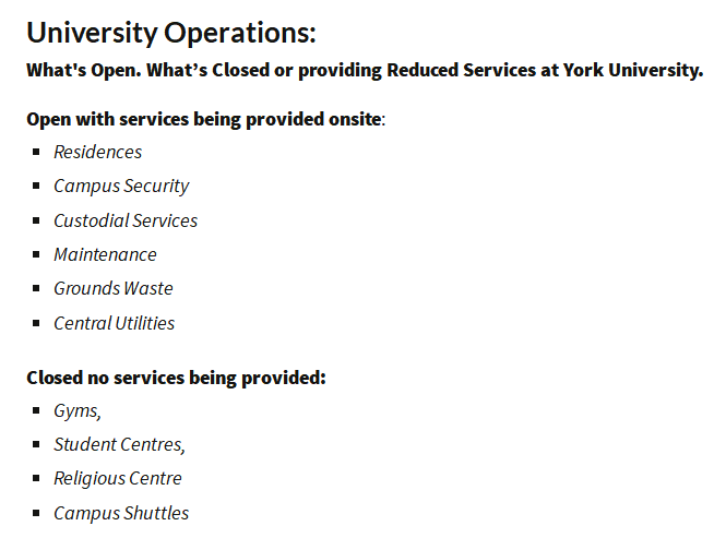 约克大学就学校运营的部门进行了归纳,目前正常工作的部门有学校宿舍、校园安保部、校园维护部、垃圾处理部门、中心设施部,关闭的有健身房、学生中心、宗教中心、校车系统等。