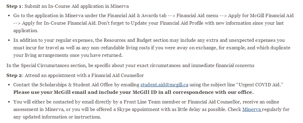 以上来自麦吉尔大学官网,主要是教学生如何申请经济救助金:联系student.aid@mcgill.ca邮箱并且标题要写为“Urgernt COVID Aid”, 会有麦吉尔大学的工作人员和你联系,并且通过线上Skype沟通的方式,确定你符合申请救助的要求(真的很困难),通过后就能领到救助金啦!