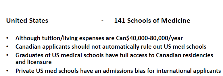 以上:美国一共有141所医学院,加拿大的申请者通常并不能把美国与加拿大相提并论,但是美国的医学院毕业生可以来加拿大顺利就业,并且美国的医学院对于国际生的招生歧视也很严重。