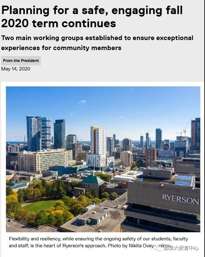 同时,瑞尔森大学已经建立了两个特别小组,来面对疫情给大学带来的挑战,并将根据实际情况制定、实行一系列可行的方案,为秋季学期可能出现的任何情况做好准备。