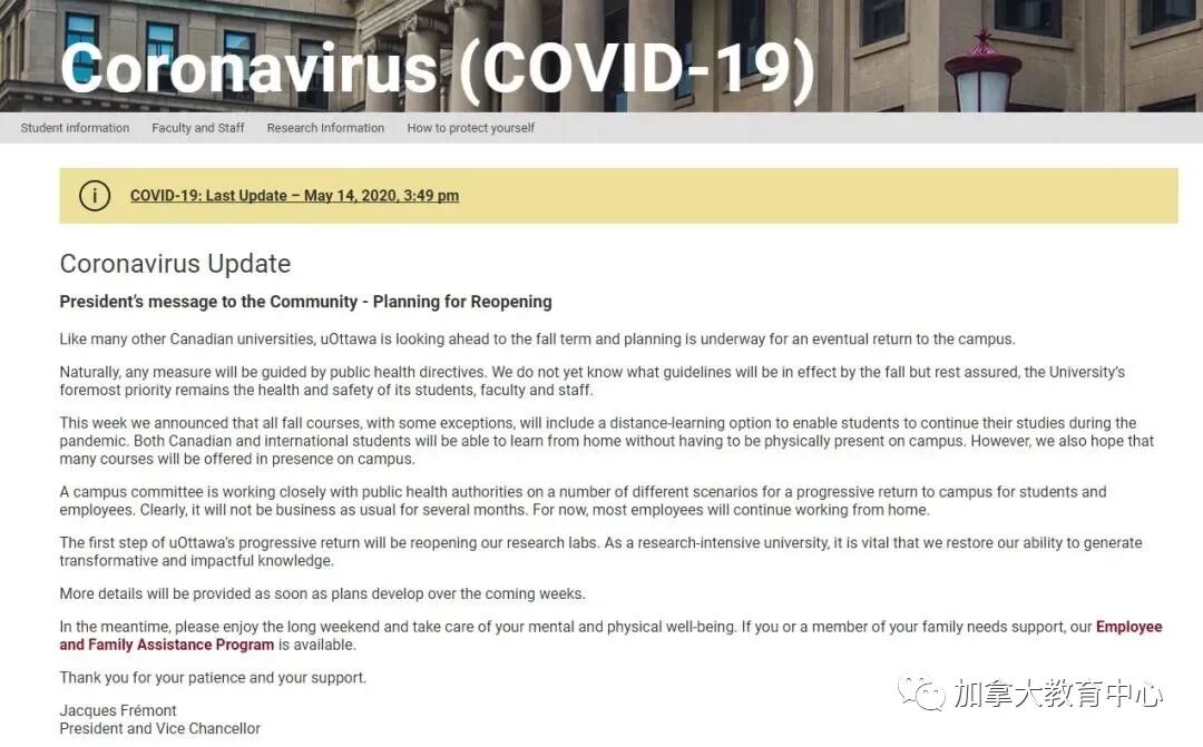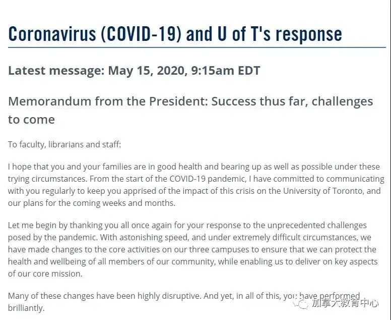 5月15日上午,多伦多大学官网上针对疫情的公开信进行了更新:“我们将努力确保学生们能够接受优质的教育,无论以何种模式进行教学。”