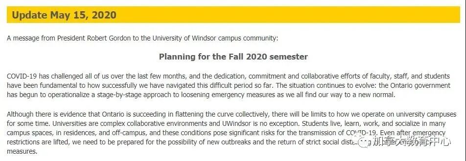 5月15日,温莎大学宣布将秋季学期的大部分课程转为网课教学。同时,期末考试也将线上进行。