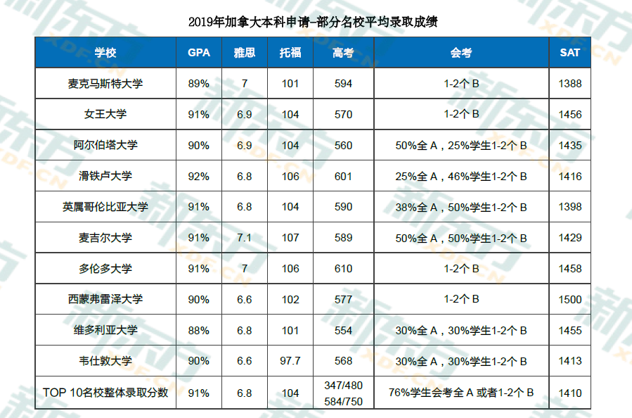 加拿大TOP10 名校被录取的学生的平均GPA:3.45到3.6之间。平均雅思分数在7以上,托福的成绩也大于100分。