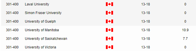 第301-400名:拉瓦尔大学,西门菲沙大学,圭尔夫大学,曼尼托巴大学,萨省大学,维多利亚大学。