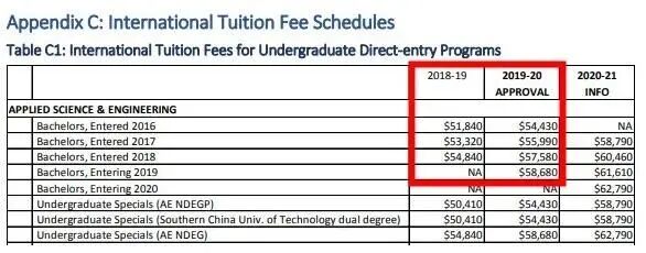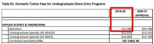 最后一列是每学期的学费(一学年=2个学期),2019~2020每年学费约为$32158加元,涨幅为$1569.44。