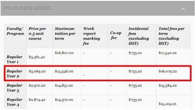根据官网的数据显示,以Health Science专业为例(假设是2018年入学)2018~2019,每年学费约为$30589加币。