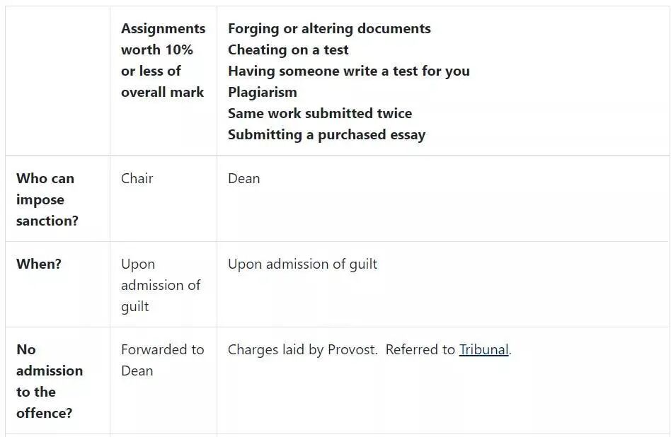 我们拿多伦多大学的“学术诚信”政策为例,如果涉及到“学术造假”,将会面临教授谈话 => 院系主席谈话 => 再根据你案件的严重情况给出相应处罚。