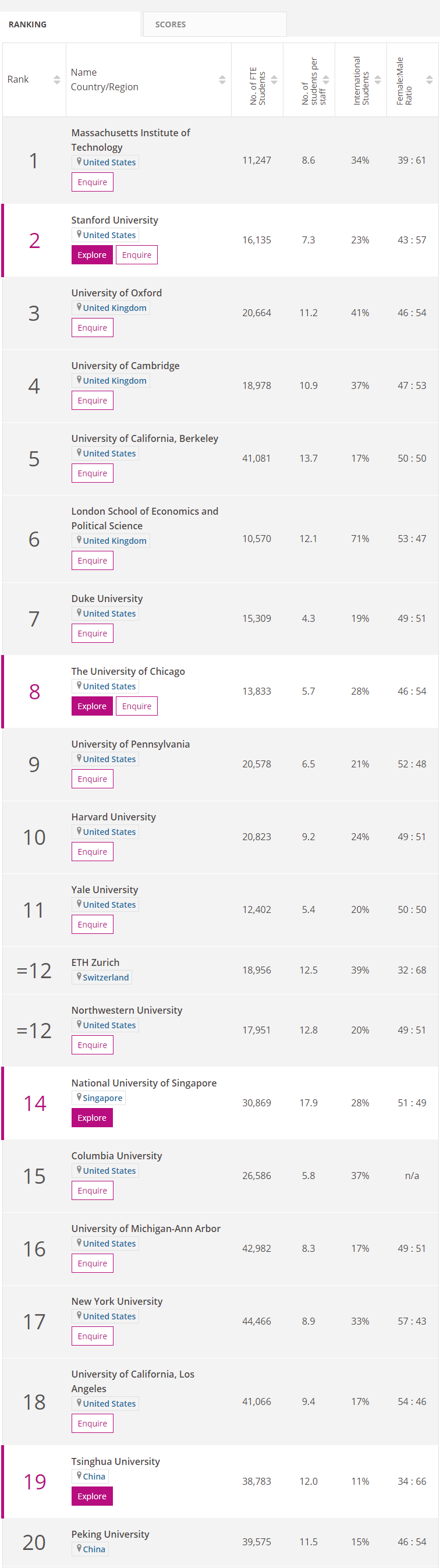 苏黎世联邦理工学院是英国和美国以外 入选的精英大学排名第8 北京大学亚洲排名最高,上升了2位至第17位,新加坡国立大学跌至第19位