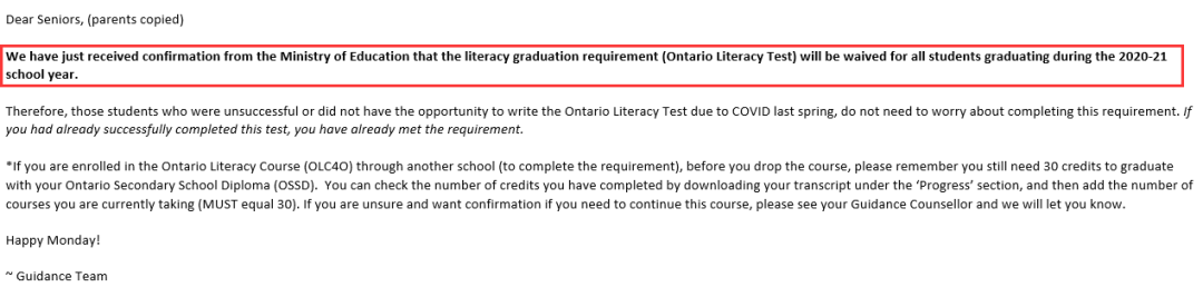 随着越来越多的省份开放入境,加拿大低龄留学又迎来特大利好消息:针对于加拿大安省明年毕业的高中生们,将不需要参加省考(Ontario Secondary School Literacy Test简称OSSLT,目前安省教育局官网上还没正式更新此变化,但加拿大安省的各个学校陆续都收到了教育局的通知。如果目前您孩子的情况也符合明年毕业或者已经高中毕业,不想参加高考或者是高中成绩不理想的,就可以充分的利用加高的背景来申请世界名校,关于详细的留学方案,快来咨询我们的前途当地的顾问老师们吧!
