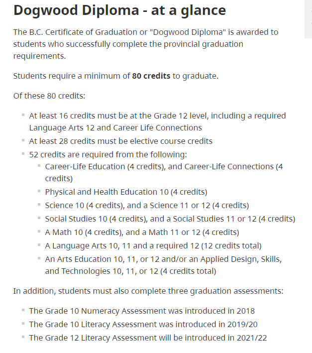 BC省的小学阶段是1-7年级,中学阶段是8-12年级,高中毕业需要修满80个学分,其中48个必修课,28个选修课,4个中学毕业过渡计划学分,通过三门省考并参加30小时的社区活动。如果满足毕业要求,最终会获得的高中毕业证为Dogwood Diploma.
