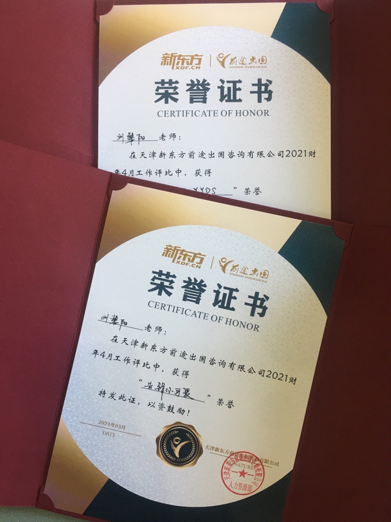 新东方金牌规划师 低龄菁英导师 硕博精英导师 CDAD职业测评解读师 钻研型顾问 ,精通英国专业和留学政策,为学生做整体留学及人生规划,提供最贴切的指导,专业的知识储备与学生个性化成长项结合;擅长发掘学生优势、紧急规划及长线规划,帮助学生制定最适合学生的留学方案,获得英国名校录取,完成梦想。 2020年 优秀员工 天津新东方前途出国 2021年 低龄菁英导师 金牌规划师 2022年 硕博精英导师 CDAD职业测评解读师 2023年 参加总裁见面会