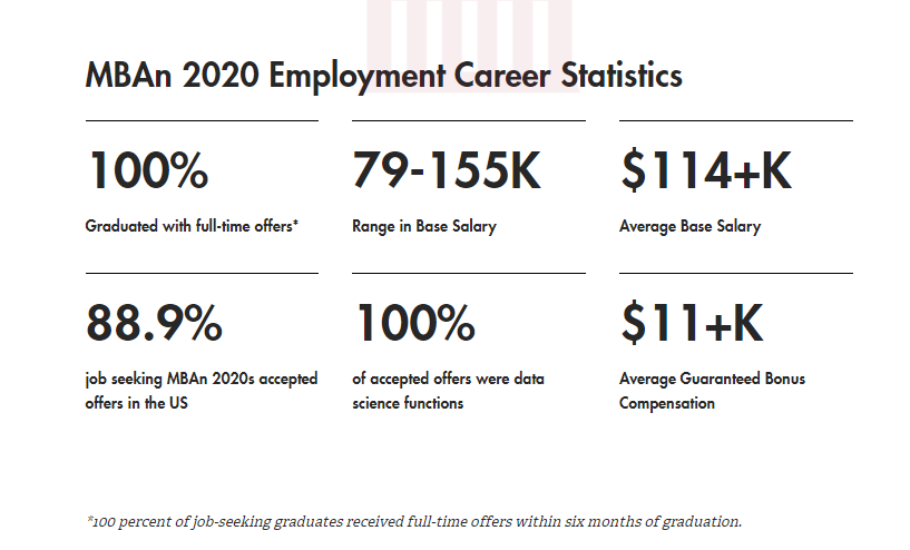 如上图所示,根据MIT2020年商业分析硕士毕业生就业分析统计,2020年商业分析毕业生都就业了,基本薪资范围7.9万-15.5万美金,平均薪资11.4万以上。88.9%的Offer为美国企业Offer,所有被接受的岗位均为数据科学相关,公司承诺的奖金平均1.1万以上