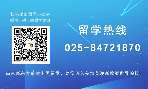 更多留学资讯尽在南京新东方前途出国官方网站https://liuxue.xdf.cn/nanjing/,或添加留学小助手,wechat号:xdfnjqt,留学热线:025 84721870。南京新东方前途出国留学,助您迈步美加英澳新欧亚世界名校。”