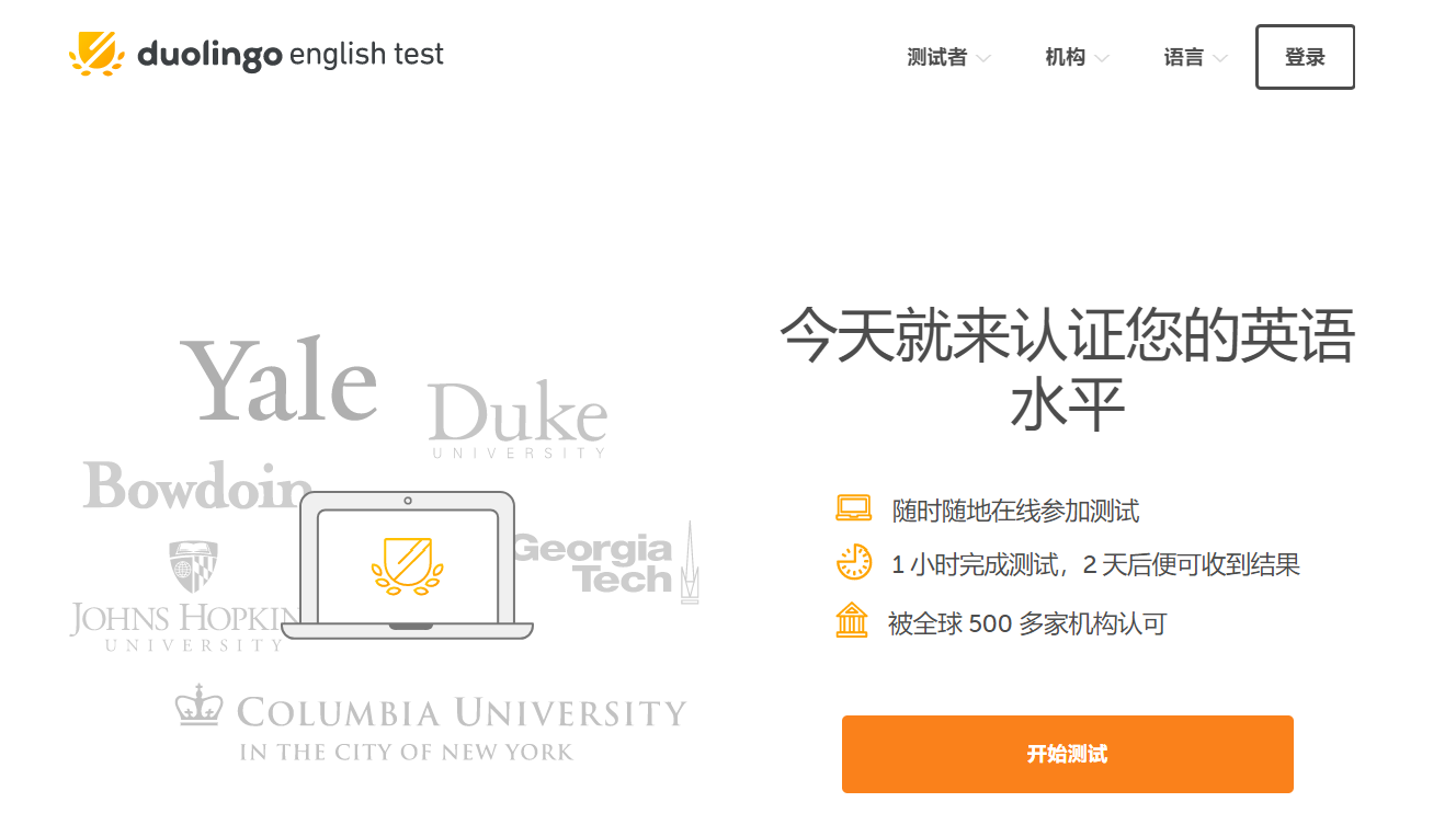 Duolingo English Test 是一项面向当今国际学生和机构的现代英语水平评估测试。测试可根据需要在线提供。您可以通过电脑和网络摄像头在家进行测试,而无需预约或前往考试中心参加测试,整个测试仅需约 45 分钟,并在 48 小时内获得认证。您可以将结果发送至无限数量的机构。美国有很多中学可以用Duolingo 考试代替托福或者雅思考试。由于国内疫情影响3月份托福及雅思取消的情况下,Duolingo 考试是一个不错的选择。