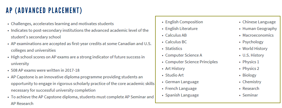 - 除了各省常规的课程外,部分学校还会开设AP课程,IB课程等,其课程门类开设非常丰富(如下图)