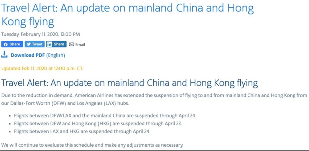 美国航空 American Airlines 宣布停飞中美航班截止日期: 中国大陆往返达拉斯/洛杉矶,停飞到4月24日 中国香港往返达拉斯,停飞到4月23日 中国香港往返洛杉矶,停飞到4月24日