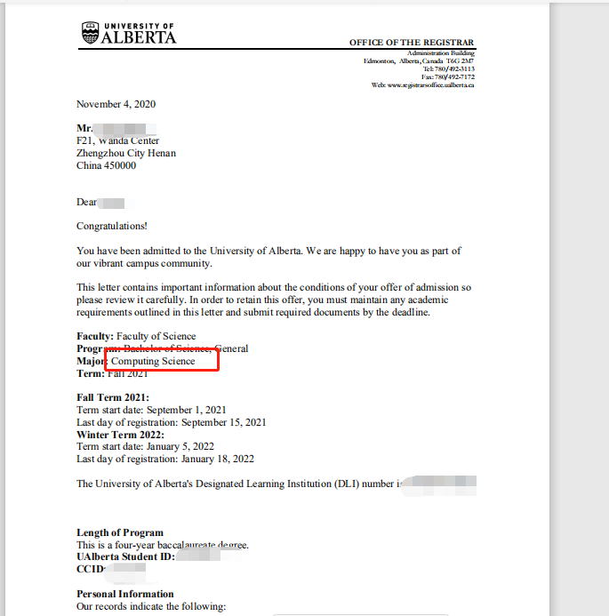 学生是洛阳第一高级中学中加班的学生,申请的是bachelor of computing science计算科学的本科,11月2日递交申请,11月4日发放录取,考虑到费用预算问题,所以对阿大情有独钟,属于梦想之校