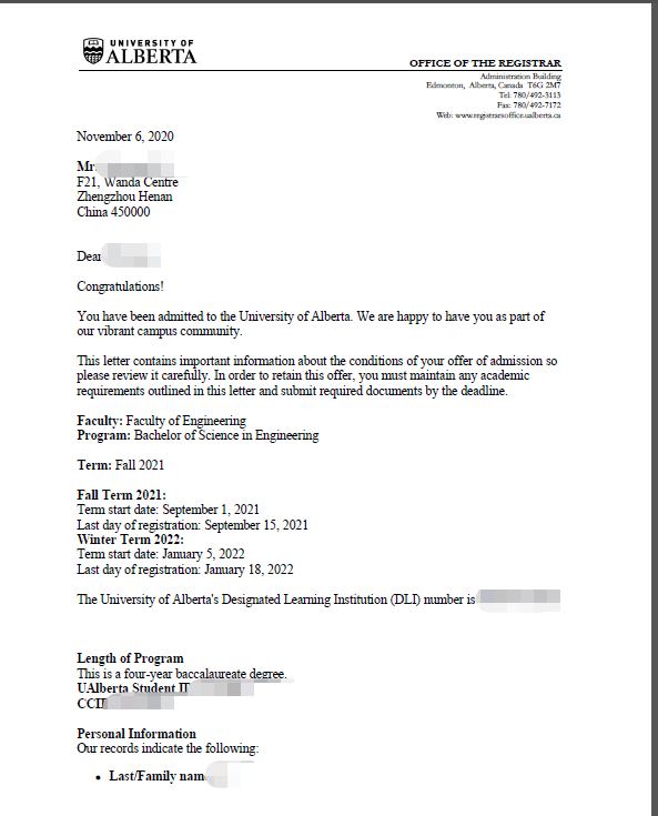 另外一点需要强调的阿尔伯塔大学可以先不用递交语言分数而下发专业课程的条件录取,语言是可以后补的,并且后补的时间非常晚给予学生充分的时间备考,这一点在申请的时候学生一直担心雅思出分问题,进行了耐心的解释说明,并鼓励早申请。