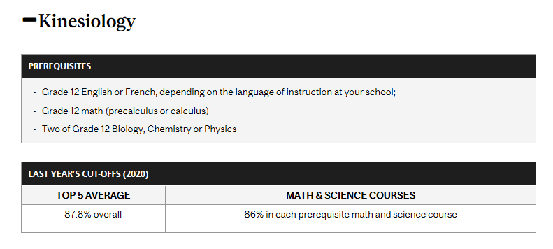 就麦吉尔大学的运动肌能学而言,2019年TOP5录取参考分数线为87.8%,需要G12的分数微积分或则预备微积分外加G12的生物化学和物理三选二,数学和理科的每一门成绩不低于86%,具体信息如下: