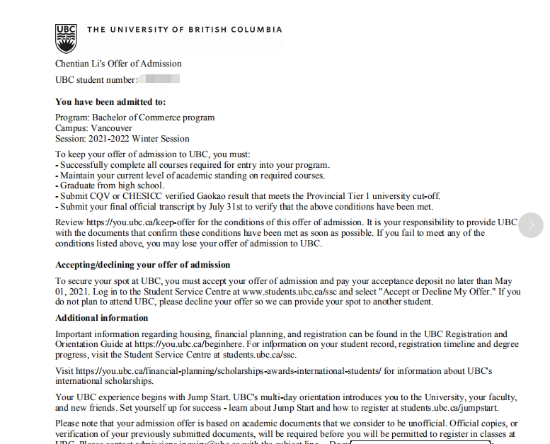 2021秋季 普高学生喜获UBC尚德商学院录取