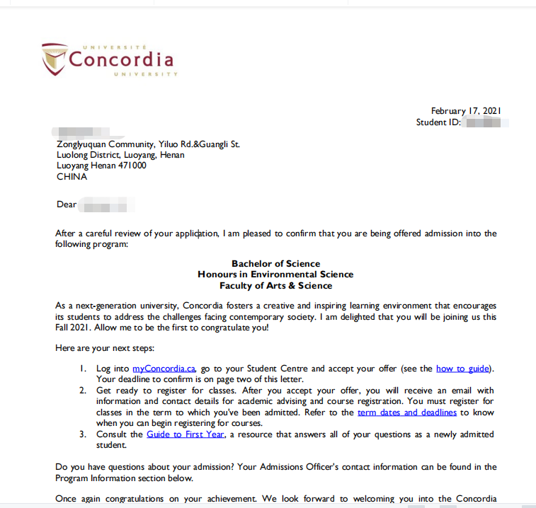 洛一高中加班的学生,体制是新斯科舍省高中I毕业证,学生和我们联系大约有一年的时间,在2020年的暑假即高二结束的时候和我们签订了委托协议,学生目标很明确,比较看重魁北克省比较好移民,于是麦吉尔大学和康考迪亚大学作为理想的目标院校,康考迪亚大学我们选择了环境科学方向,日后的职业目标是定位在那边开一个相关的公司,自己创业。