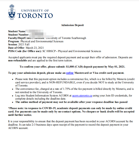 5. 接受offer的截止日期:2021年5月1日前;接受的话还需要缴纳1000加币押金,以确保位置(押金在正常入学后会转作为学费的一部分;如接受offer后放弃入读,已缴纳的押金不再退还)。