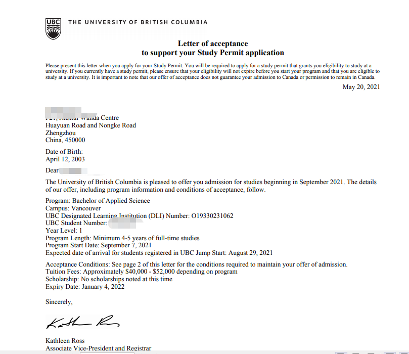二外中加班吕同学喜获UBC工程专业主校区直录