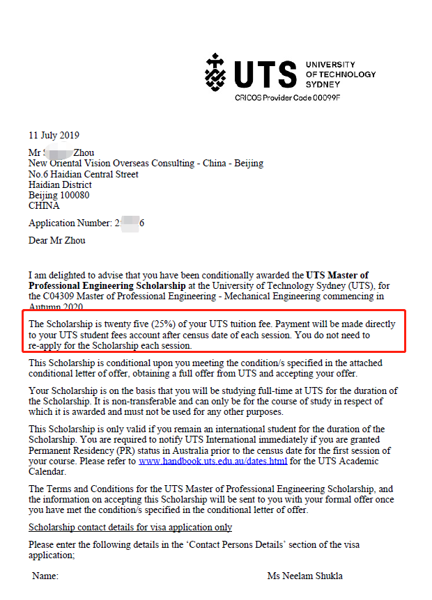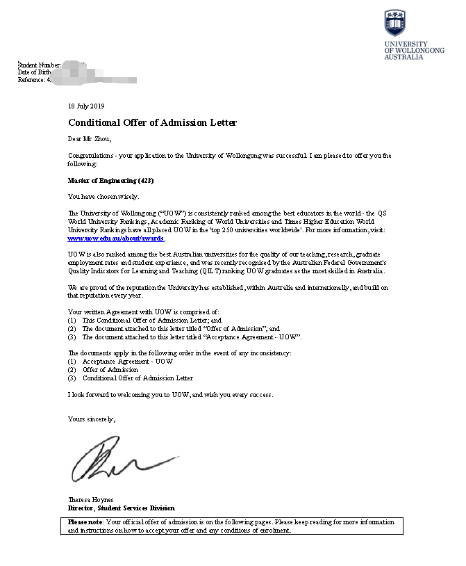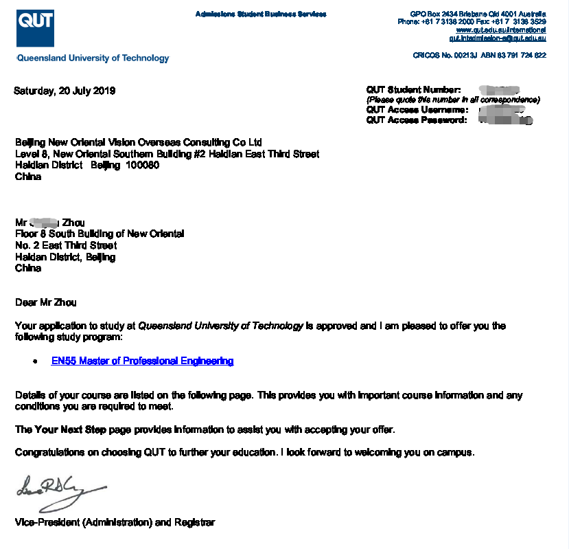 在签约后,我们团队以最快的速度指导和帮助学生开取申请所需材料,争取把每一步都提前准备,不浪费任何时间。事实证明,机会都是降临在准备充分的人身上的。在签约后的20天左右,我们就成功帮助学生拿到以上三所大学录取通知书,并且为学生申请到了约合人民币近9万元的奖学金。