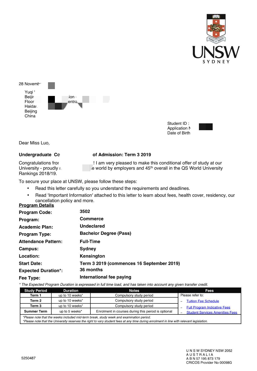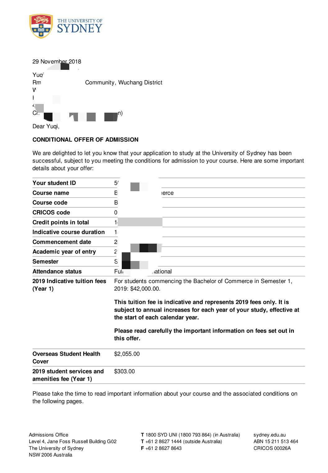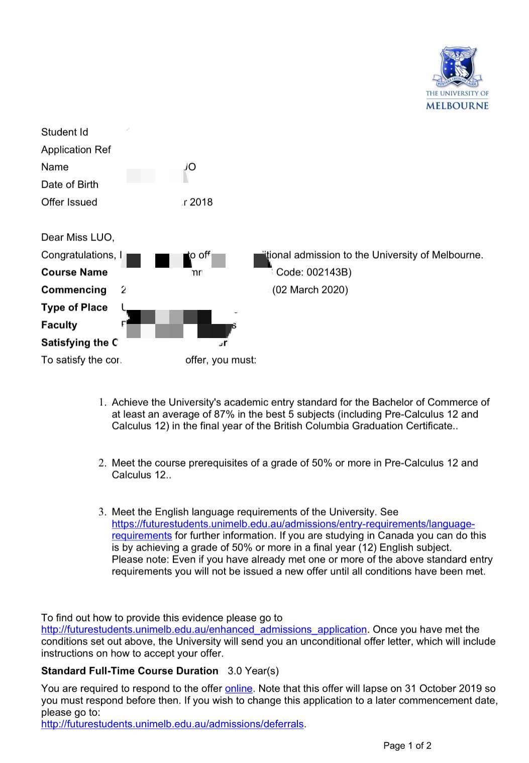 2. 在递交申请之后的16天之后,我们陆续收到了墨尔本大学,悉尼大学,新南威尔士大学的offer,学校对于学生的12年级成绩都给出了明确的要求,也是在学生可以达到的范围以内。同时悉尼大学明确回复雅思需要重新考试,当时学生误听其他渠道的消息说雅思成绩过期一两天,可以去向悉尼大学去求情。我们再次和悉尼大学沟通,学校明确回复雅思过期一天和过期一年都是一样的需要重新考试,没有提供过期雅思拿到offer的录取的事情。