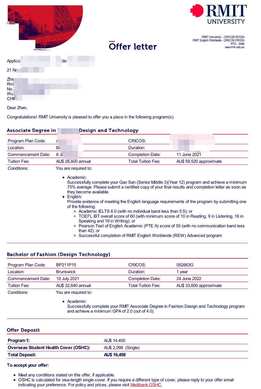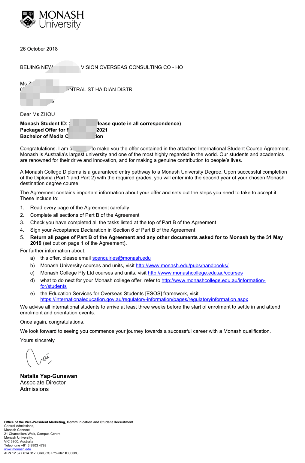 2. 递交申请之后的4周左右,蒙纳士大学和皇家墨尔本理工大学都拿到录取,就等学生的托福成绩和高中毕业证了。