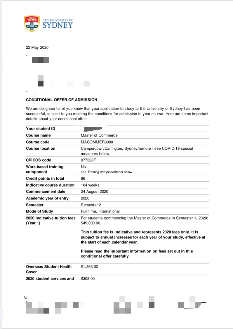 5月初的时候,学生的终于在递交材料的2个星期内,如愿的拿到了 QS世界前50的悉尼大学的录取。