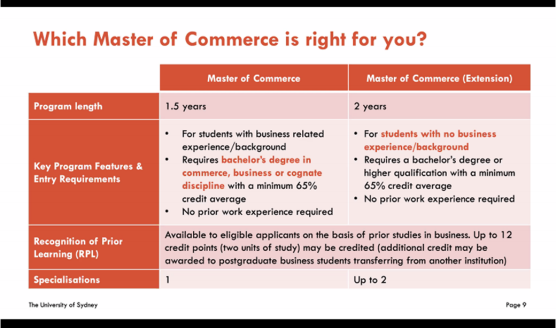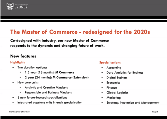 今年,悉尼大学针对2021年开学的Master of Commerce进行调整,区分为: