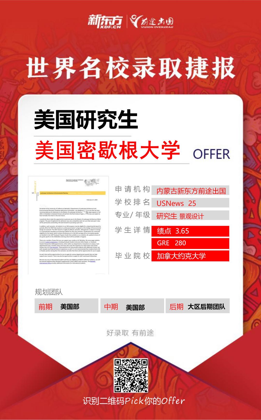 熟人推荐找到我之后,我首先给赵同学分析了他的优势:赵同学虽然没有在美国读本科,但是有三年的海外本科经历,托福这一块可以不用担心。另外他有工作经验,虽然只有短短的半年,但是他对自己的专业理解更深刻了,也意向申请景观设计这个方向。沟通好了留学诉求之后我们接下来就快速制定留学方案了,GRE首先肯定是要考的,但是景观设计主要的录取比重还是在作品集上的,所以我建议学生把大部分的精力和时间都放在作品集的创作上,结合他工作的一些经验和领悟,展示了更多创造的过程,并且文书我们也先后修改了三版,体现了他独特的想法和理解。虽然GRE得分比较低,一度让赵同学比较忐忑,我也一直给他鼓励和支持,最后终于拿到了密歇根大学和加州大学伯克利分校的录取。