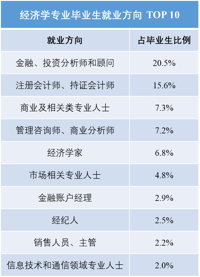 根据英国高等教育统计局(The Higher Education Statistics Agency)最新数据,金融和投资分析、注册会计师、商务助理、管理咨询和商业分析等职业,是经济学专业毕业生最常选择的职业。