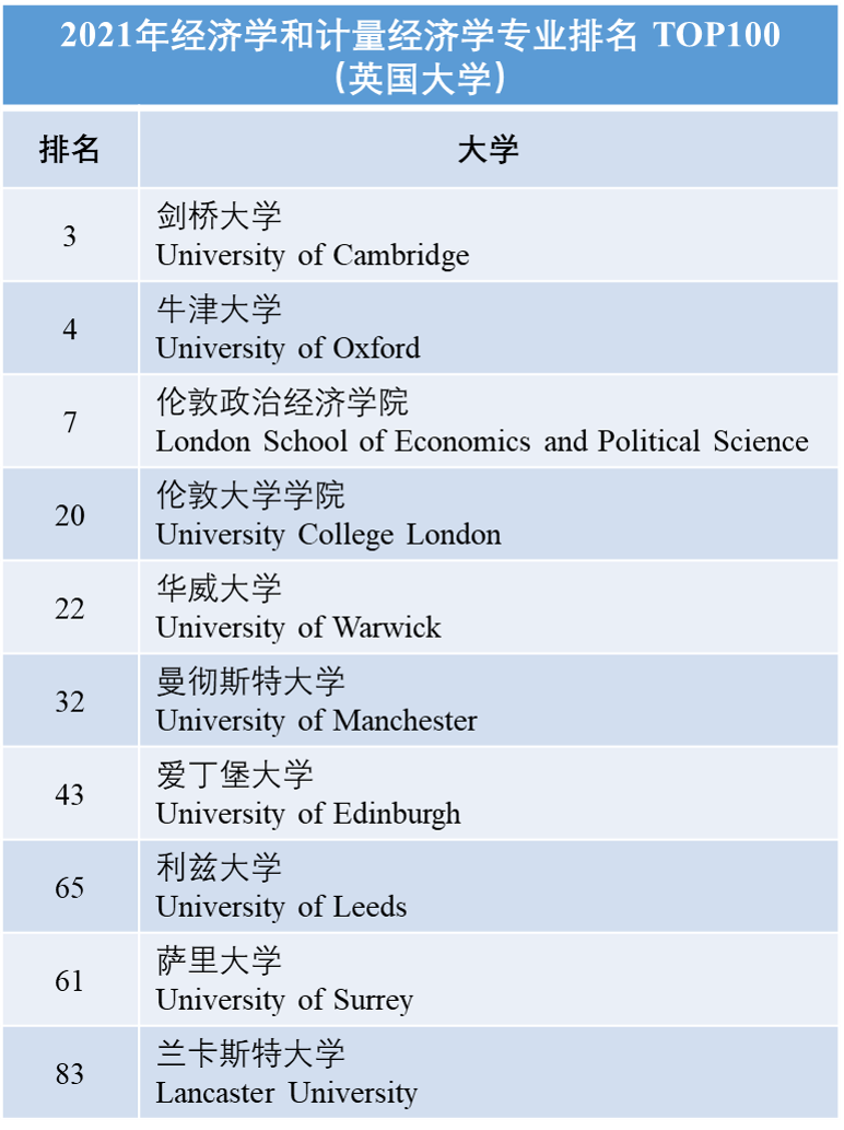 最后,附上2021年The World University Rankings(THE)经济学和计量经济学专业排名前100的英国大学,供学生和家长参考!