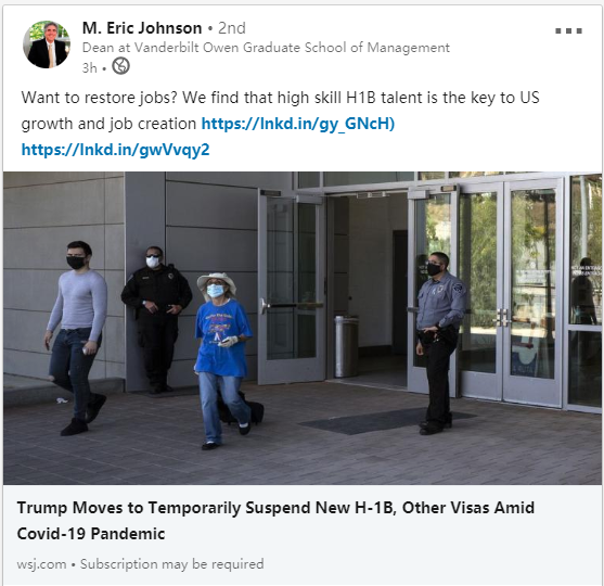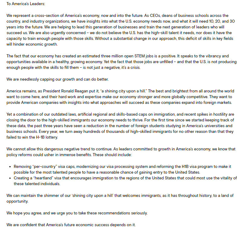 今天的政令发布后,范德堡大学欧文管理学院院长Eric Johnson第一时间在LinkedIn上分享了一封给美国政府领导人的公开信,该信件由美国55所商学院院长和15位CEO联合签名,其中包括耶鲁、康奈尔、加州伯克利、哥伦比亚和斯坦福大学等知名高校。